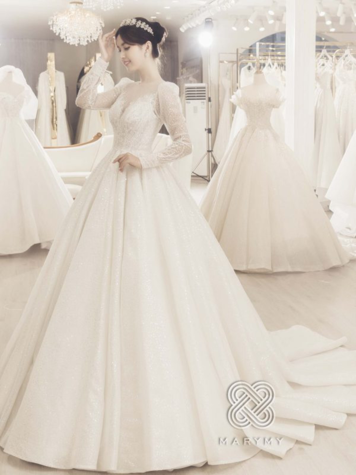 Form dáng: váy cưới xòe trễ vai tay dài